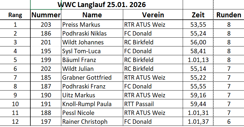 Bei den Herren siegte Markus Preiss vom RTR Atus Weiz mit einer Zeit von rund 53:55 Minuten und 8 absolvierten Runden.